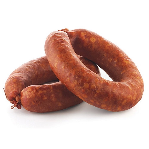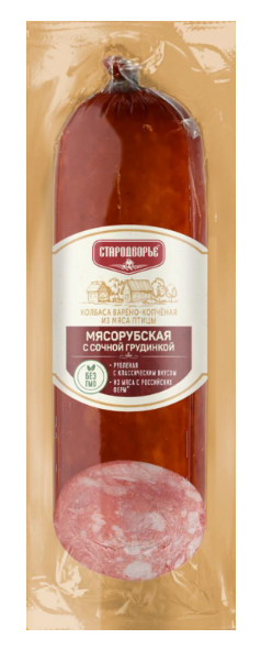Состав: мясо птицы механической обвалки, филе птицы, шпик, вода питьевая, шкурка свиная, крахмал картофельный, крупа манная, соль поваренная пищевая, пищевая добавка "Арсимикс экстра комби", соевый белок, чеснок, загуститель - каррагинаны, пищевой краситель кошениловый, фиксатор окраски Е250.