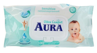 Салфетки влажные для детей AURA Ultra Comfort с экстактом алоэ и витамином E уп.100 /с крышкой/